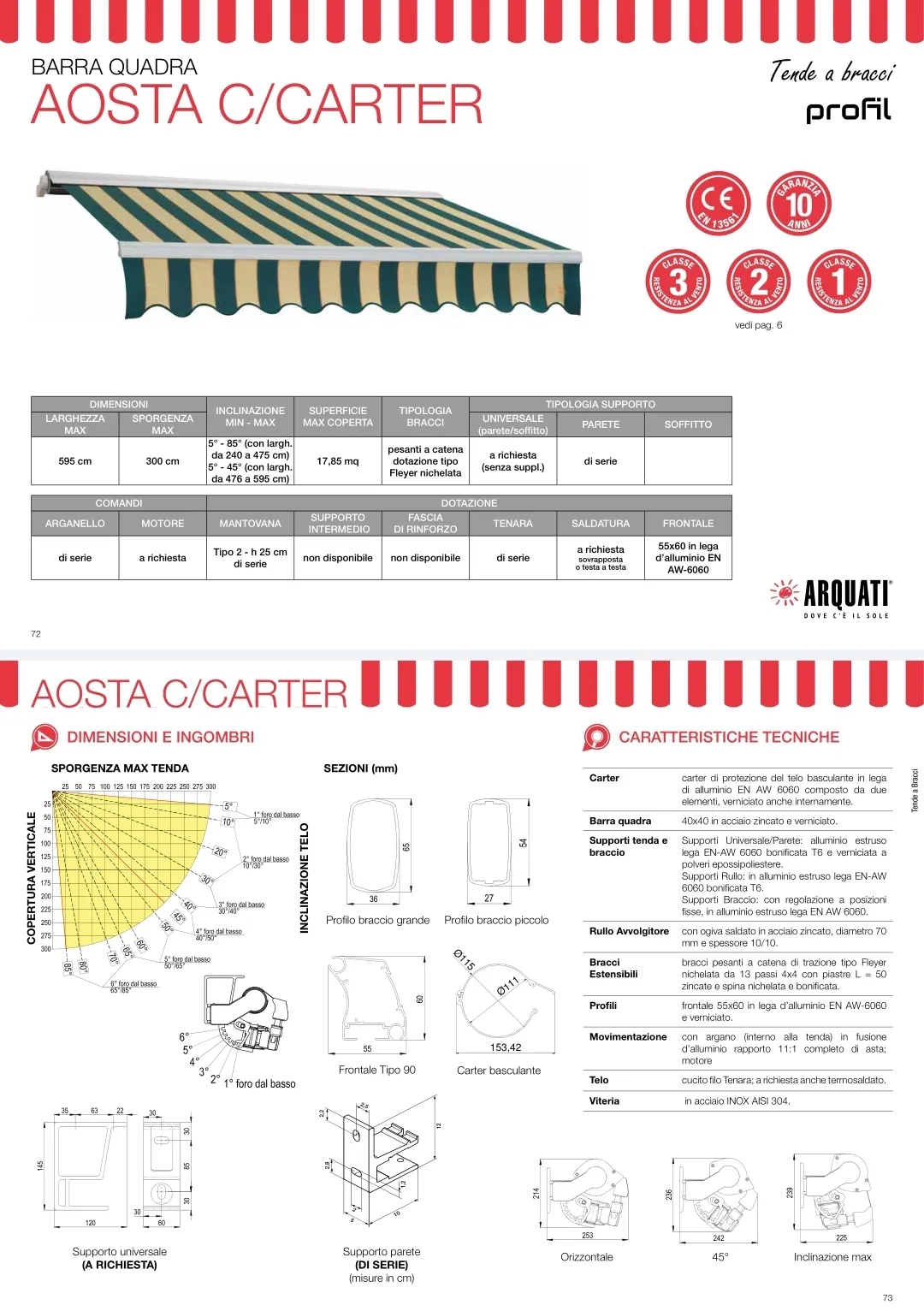 La tenda da sole Arquati Aosta C/Carter è una soluzione avanzata e robusta per la protezione solare, ideale per chi cerca un prodotto di qualità superiore. Questa tenda a bracci estensibili si caratterizza per la sua costruzione con barra quadra di 40 x 40 mm e un carter di protezione che avvolge completamente il tessuto, proteggendolo efficacemente dall'usura causata da inquinamento e agenti atmosferici. I bracci della tenda utilizzano una trasmissione a catena di trazione tipo Fleyer, offrendo affidabilità e durata. Con supporti per il braccio in alluminio estruso della lega EN AW 6060 e regolazione a posizioni fisse, la struttura garantisce stabilità e resistenza. Il carter, realizzato in lamiera calandrata, insieme al profilo frontale di 55x60 mm con lamella di rifinitura da 25 mm abbinata al colore della passamaneria, conferisce alla tenda un aspetto elegante e finemente curato. Tutta la viteria è in acciaio inox AISI 304, per una maggiore longevità. Una novità interessante è l'opzione del braccio a misura, pensata per realizzare tende su misura in dimensioni inferiori alla larghezza minima standard, offrendo così una personalizzazione ulteriore per adattarsi a ogni esigenza specifica.