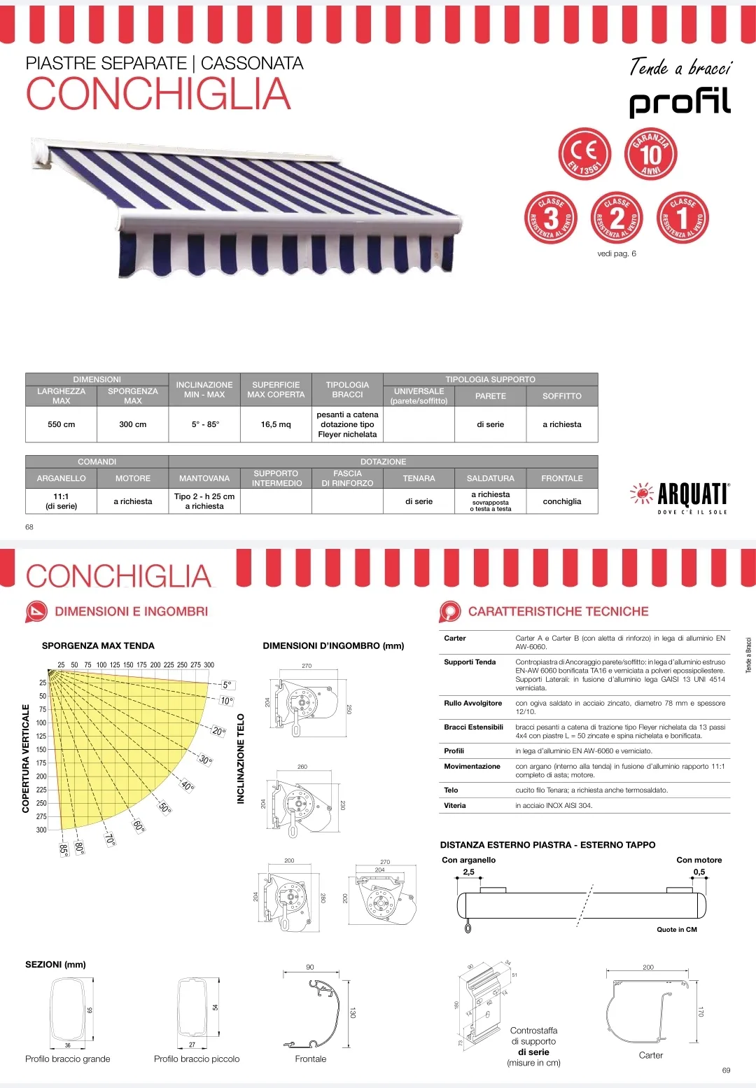 La tenda da sole Arquati Conchiglia XL è una soluzione di alta qualità per la protezione solare, caratterizzata da un design elegante con cassonetto che permette una scomparsa totale del tessuto. Costruita con materiali resistenti come l'alluminio per piastra di chiusura e fissaggio a muro, e bracci pesanti in acciaio inox per il modello XL (con opzione Light disponibile), garantisce durabilità e affidabilità. Dotata di un argano in fusione di alluminio per una facile manovrabilità, può estendersi fino a 590 cm di larghezza e 300 cm di sporgenza, offrendo ampia copertura. La Conchiglia XL è ideale per chi cerca una tenda da sole robusta, elegante e funzionale.