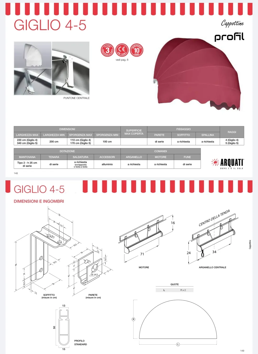 Il modello Giglio di Arquati rappresenta l'eccellenza nel mondo delle capottine, distinguendosi per il suo design tondo e le sue linee morbide, disponibili in configurazioni a 4 o 5 raggi. Queste tende, con profilo piatto da 50 mm, incarnano la tradizione della lavorazione artigianale, con ogni profilo centinato a mano, testimoniando un impegno alla qualità e alla cura dei dettagli che si tramanda nel tempo. Lo stile sofisticato delle tende Giglio è pensato per offrire soluzioni esteticamente affascinanti, capaci di integrarsi perfettamente con l'ambiente circostante, migliorando l'aspetto esteriore e la funzionalità degli spazi abitativi o commerciali. Grazie alla possibilità di personalizzazione, le tende Giglio non solo valorizzano l'estetica di insegne, portoni e finestre di residenze di pregio, ma garantiscono anche privacy e protezione, mantenendo inalterata la vista sul paesaggio. Le articolazioni in lega di alluminio pressofusa GAISi13 UNI4514 e la viteria in acciaio inox assicurano durabilità e resistenza, facendo delle tende Giglio una scelta durevole nel tempo per chi cerca eleganza e funzionalità.