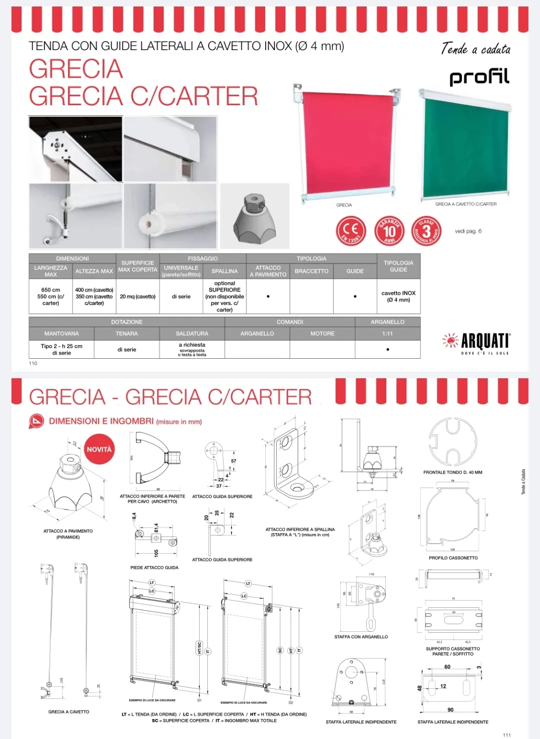 Le tende da sole Arquati Recia e Grecia C/Carter rappresentano una sintesi perfetta tra funzionalità e design moderno, ideali per chi cerca una soluzione elegante e pratica per proteggere gli interni e ridurre la temperatura all'interno dell'abitazione. La tipologia costruttiva di entrambi i modelli si basa su una tenda a caduta verticale, con il telo guidato lateralmente da cavi o tondini in acciaio INOX, una scelta che garantisce affidabilità e un aspetto visivo minimale. Le staffe laterali indipendenti offrono versatilità nell'installazione, permettendo l'ancoraggio sia a parete che a soffitto o spallina, mentre il profilo frontale tondo di diametro 40 mm enfatizza la linea pulita e moderna della tenda. La differenza principale tra i due modelli sta nella presenza del carter nel modello Grecia C/Carter, che aggiunge un ulteriore livello di protezione al telo, mantenendo le stesse caratteristiche estetiche e funzionali. Entrambi sono dotati di viteria in acciaio INOX AISI 304, assicurando durabilità e resistenza nel tempo. Queste tende sono la soluzione ideale per chi desidera combinare l'efficienza nella protezione solare con un design raffinato e poco invasivo.