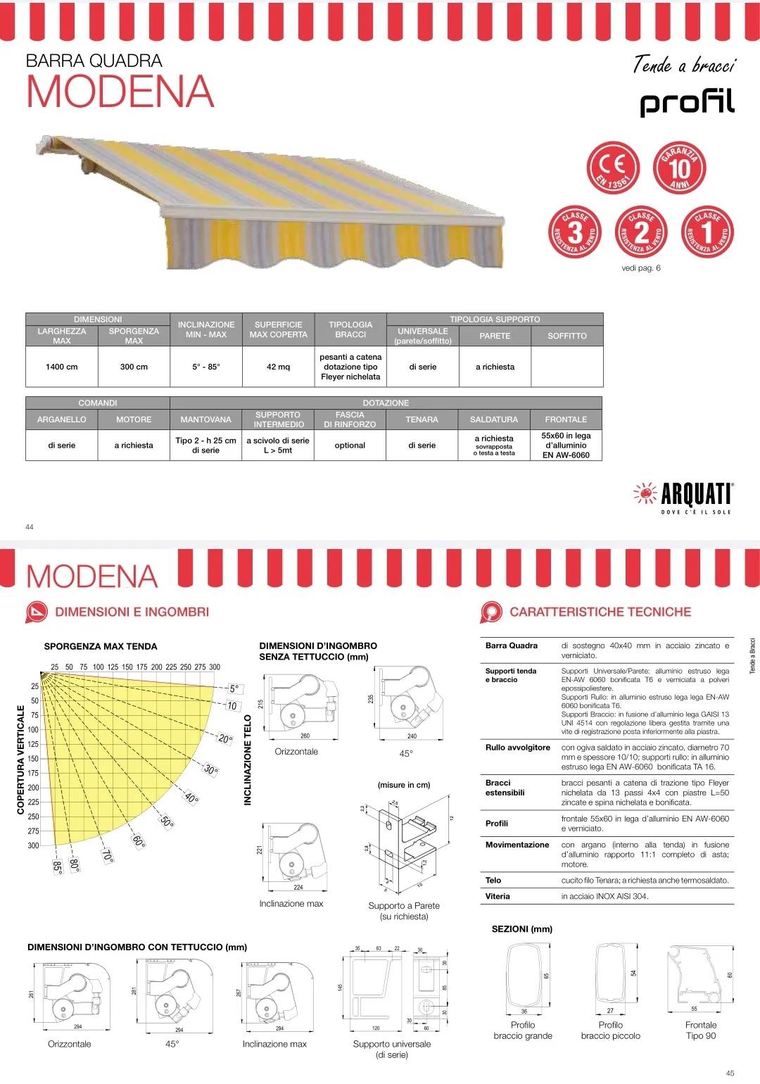 La tenda da sole Arquati modello Modena è un'eccellente soluzione per trasformare una semplice terrazza in uno spazio da vivere ed arredare con stile. Assemblata su barra quadra 40x40 in acciaio zincato e verniciato, offre ottime prestazioni e un volume contenuto, consentendo una perfetta modulazione della luce e un design accattivante e versatile. Con bracci con trasmissione a catena tipo Fleyer e viteria interamente in acciaio inox, questa tenda è disponibile sia per medie che grandi superfici, rappresentando il completamento indispensabile per creare un ambiente outdoor accogliente e raffinato.