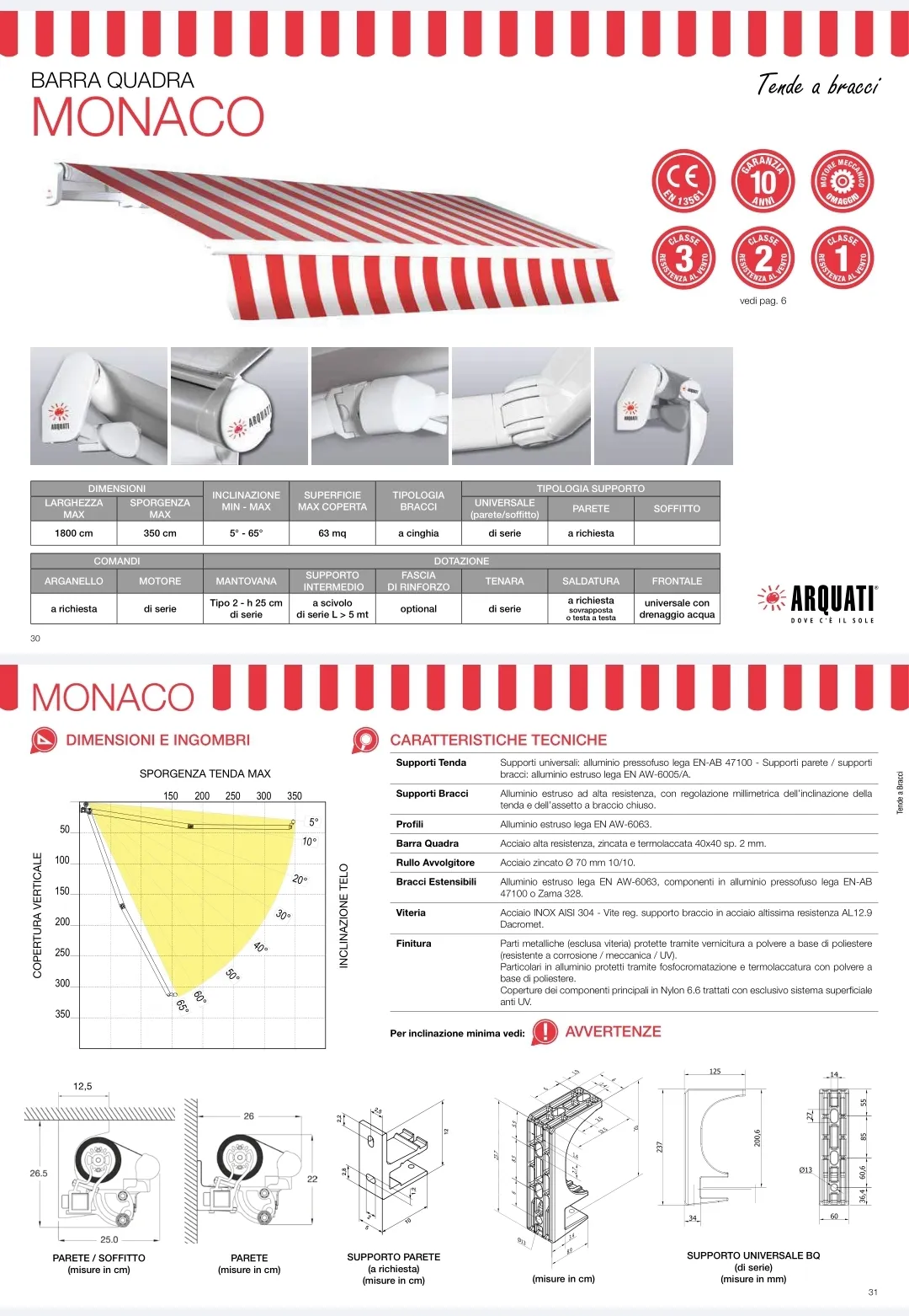 La Tenda da Sole Arquati Modello Monaco rappresenta un'elegante soluzione funzionale per proteggere dagli agenti atmosferici. Assemblata su una robusta barra quadrata 40x40, dotata di un terminale innovativo con sistema di drenaggio per l'acqua, questa tenda offre stabilità e versatilità. Con misure che vanno da una larghezza minima di 190 cm a una massima di 1800 cm e una sporgenza minima di 150 cm fino a una massima di 350 cm, il modello Monaco si adatta a diverse esigenze.