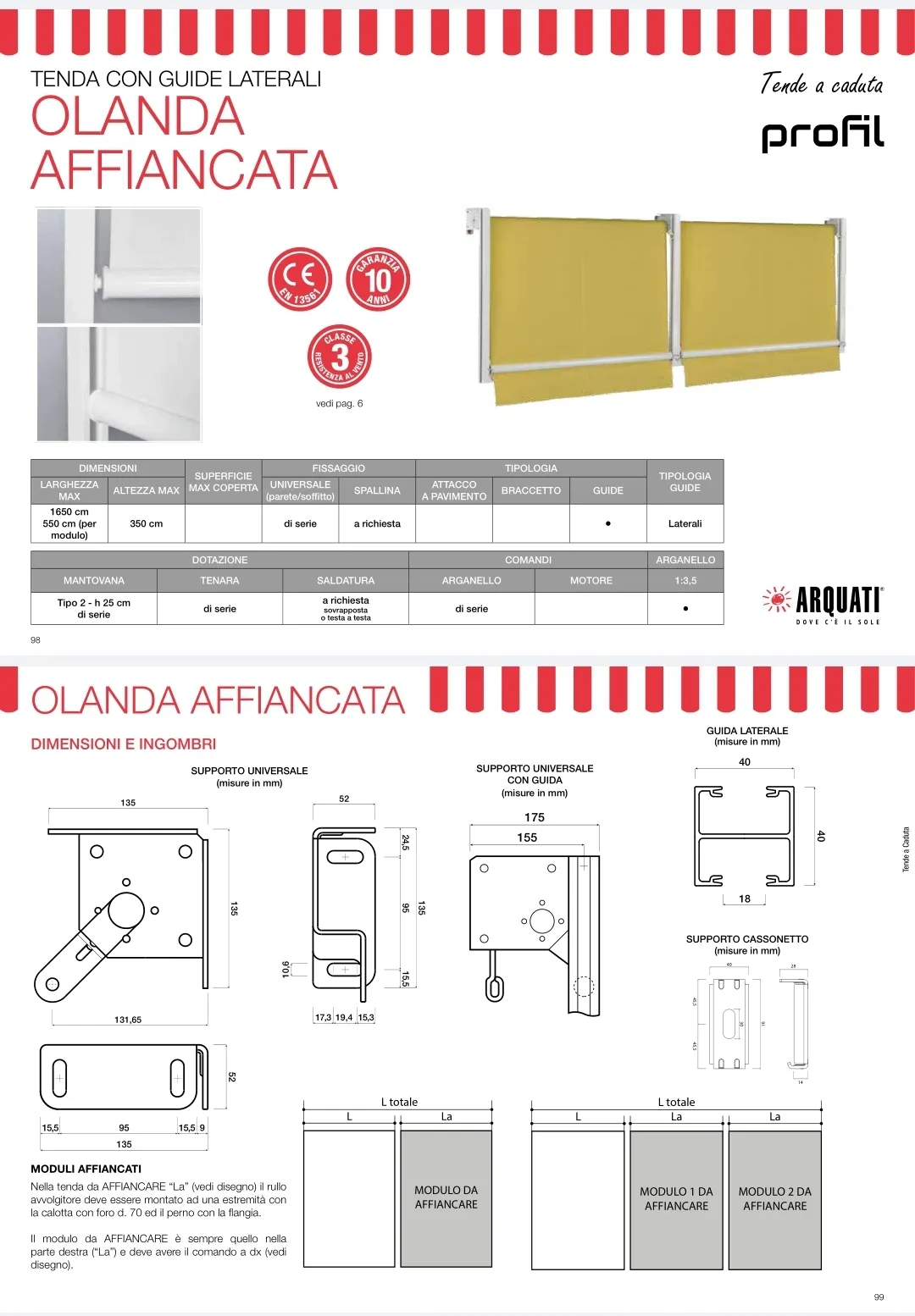 La tenda da sole Arquati modello Olanda Affiancata è la soluzione ideale per chi cerca una copertura esterna capace di adattarsi a spazi ampi come balconi, terrazze e verande. Questa variante mantiene tutte le qualità apprezzate del modello Olanda, inclusa la sua eleganza e semplicità nel design, rendendola attuale e versatile per diverse applicazioni. La caratteristica guida ad H permette di unire due o più tende con un unico profilo centrale, offrendo una continuità visiva e funzionale senza precedenti. Grazie alle staffe laterali indipendenti, che si possono adattare sia per l'ancoraggio a parete che a soffitto o spallina, insieme a guide laterali fisse per un migliore scorrimento del telo e un profilo frontale tondo di diametro 40 mm, la tenda Olanda Affiancata garantisce una durabilità e resistenza nel tempo grazie alla viteria in acciaio Inox. Questa tenda rappresenta una scelta ottimale per chi desidera unire funzionalità e stile nell'ombreggiatura di grandi spazi esterni.